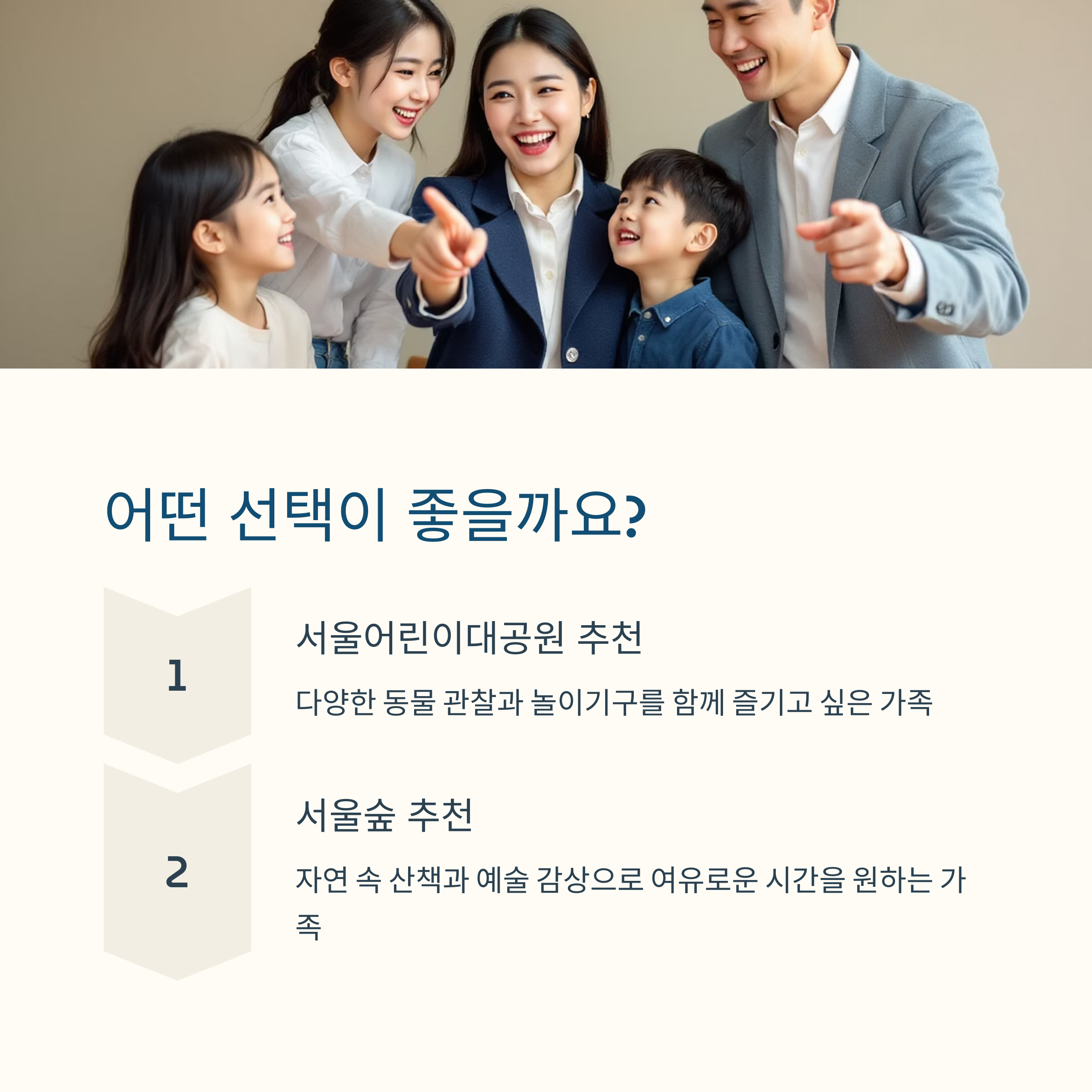 - 아이와 다양한 동물을 관찰하고 놀이기구를 즐기고 싶다면: 서울어린이대공원 동물원이 적합합니다. 다양한 동물과 놀이시설이 함께 있어 아이들이 즐겁게 시간을 보낼 수 있습니다.